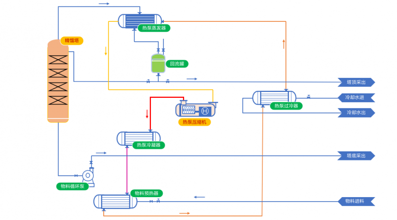 一類是直接式熱泵精餾,如MVR裝置,熱泵壓縮機(jī)直接壓縮塔頂氣相增壓升溫,再直接用于再沸器加熱,壓縮機(jī)壓縮的是塔頂物料氣體;